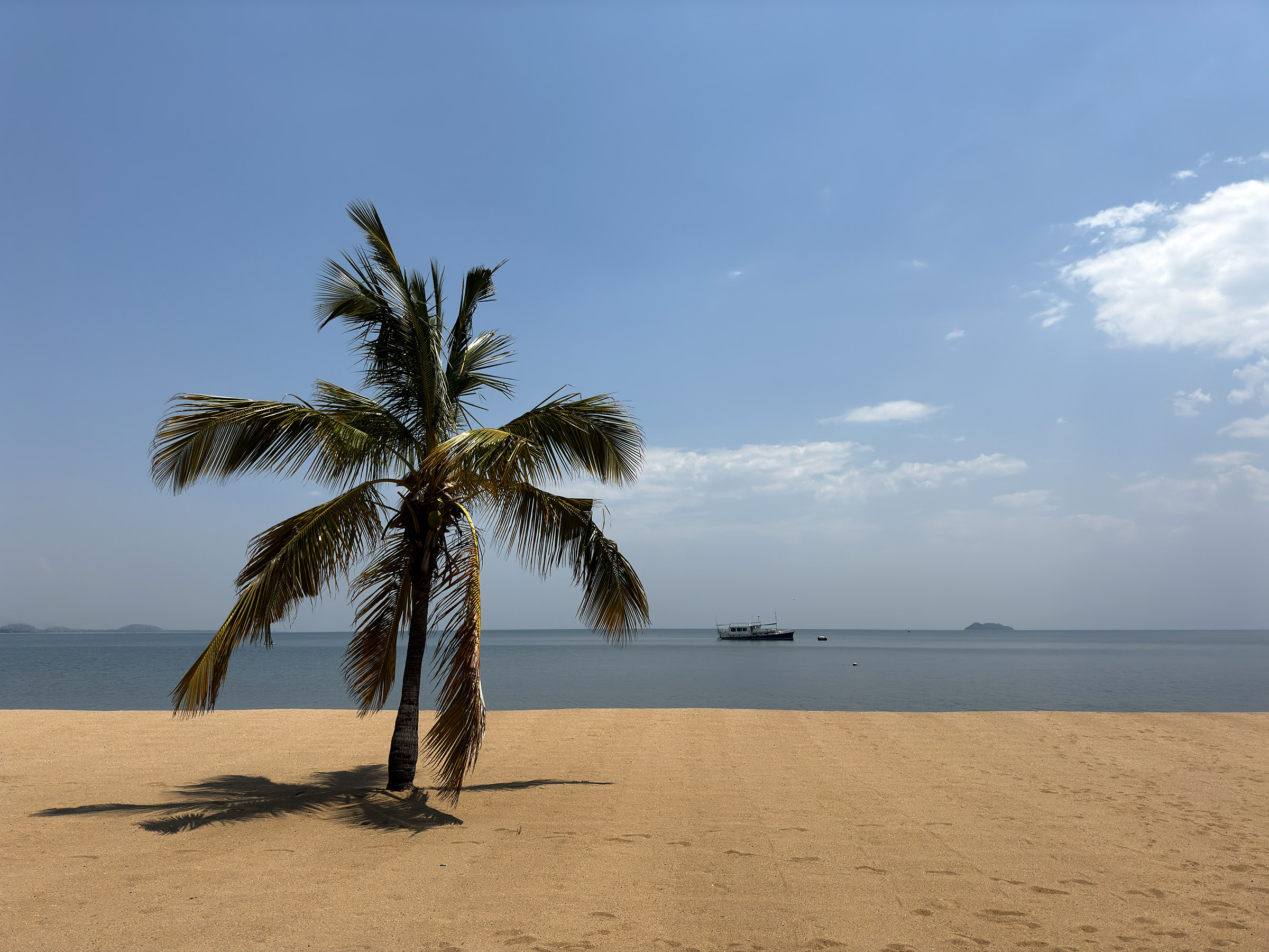 早餐后的我,静静地坐在沙滩的长椅上,欣赏着眼前的景色:脚下是柔软的沙滩,高大的棕榈树安静地矗立着,远方的湖水绵延望不到尽头,一只小船就像被图钉钉在湖水上,一动不动。没有一丝风,所以吹不起波澜,时间似乎静止了,把眼前的一切凝固成了一幅水彩画,而我就是画中的一抹背影……